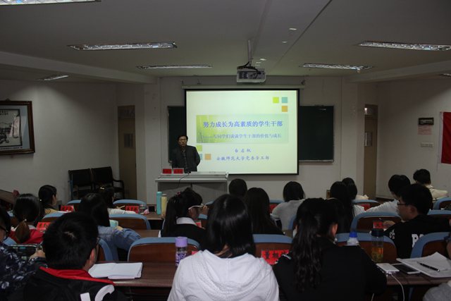 台启权老师从新形势背景下学生工作面临的大众化、学分化、信息化、社会化等挑战入手,重点阐述了高校学生干部及其作用、选拔和组建、培养和使用、队伍现状与问题四方面内容。他着重强调了学生干部角色定位,要求兼顾好“特殊的学生”和“特殊的干部”的双重身份,做好老师的助手、学生的表率、师生之间的桥梁和纽带。