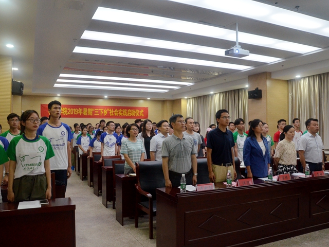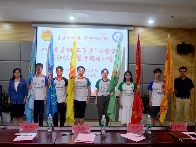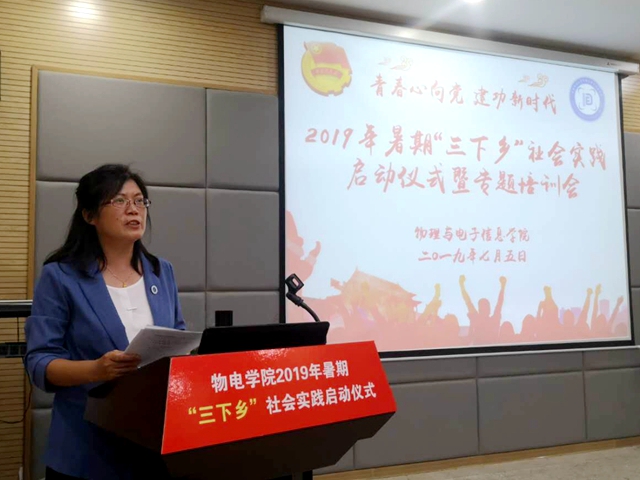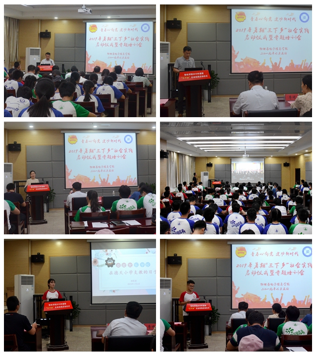 在物理楼335报告厅隆重举行2019年暑期“三下乡”社会实践启动仪式暨专题培训会。校团委副书记汪凯,社会实践思政指导老师李靖,学院党委书记李娟、副书记黄友生、副院长许新胜,指导教师代表张爱清、汪志荣、蔺玉柱,全体专兼职辅导员以及实践队员代表参加了启动仪式。仪式由学院团委书记宋凤楼主持。