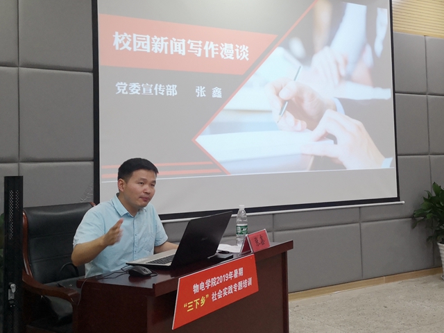 专题培训会上,党委宣传部张鑫、保卫处周海燕先后进行了宣传工作培训和实践安全培训。张鑫结合自身工作经历,讲授了撰写校园新闻稿件的技巧和方法。结合优秀新闻稿件,他逐字逐句对到场人员进行了业务培训。他希望全体宣传员们能用及时专业、饱含真情的文字记录实践的点滴瞬间,传播青春正能量,发出师大好声音。周海燕从近年来校园安全事件入手,提醒队员们实践期间要注意人身安全、财产安全、消防安全、交通安全、社交安全,要求大家牢记实践纪律要求,一切行动听指挥,切实保障实践队员和服务对象的安全。