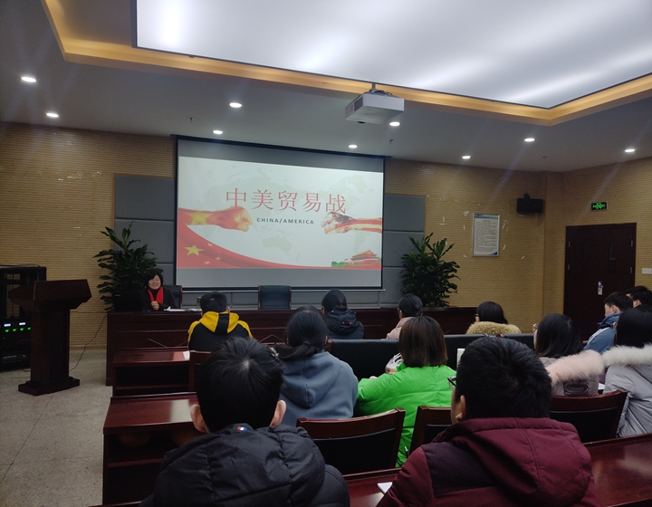 本网讯(17电子 沈翔)为了帮助同学们了解国际经济局势,明晰自身肩负的时代责任。12月26日上午在物理楼304会议室,学院党委书记李娟为2017级电子信息工程专业的同学们讲授关于“中美贸易战”的形势政策课。