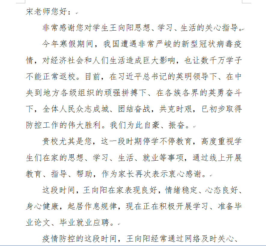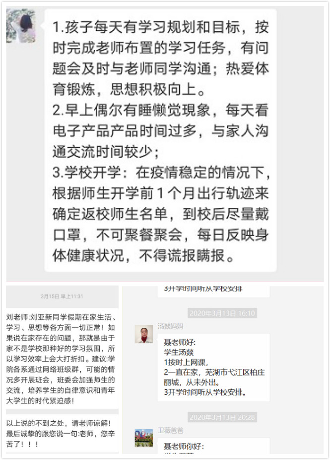 “云家访”,家校携手共育人。为构建家校抗疫连心桥,实现家校携手共育人,学院通过官方网站和各班级家长群发送了《致学生家长的一封信》,动员家长积极配合学校做好学生疫情防控工作、关心督促学生在线学习、关注孩子身心健康、加强同辅导员联系,家校协作,及时沟通,合力做好学生教育管理工作。各年级还利用家长微信群、QQ群等方式陆续开展“云家访”活动,全面了解学生在家思想动态、居家生活和学习等方面情况,掌握当下学院工作开展过程中的共性和个性问题,有效加强家校间的互动沟通,受到家长好评。