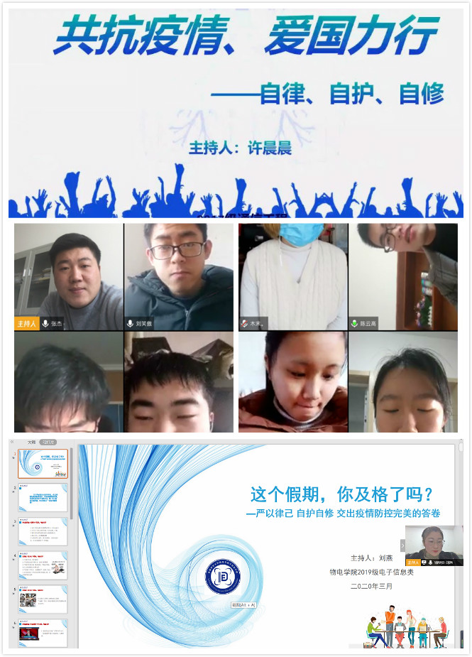 “云班会”,同“屏”共振重引领。为做好疫情防控期间学生思想政治教育工作,结合学校系列主题班会文件要求,学院各年级辅导员精心组织召开“云班会”,认真传达落实教育部、省教育厅、学校关于防疫的相关要求,同时围绕爱国主义、社会责任感、“三自”教育以及疫情防控期间涌现出的先进典型、英雄事迹等主题,引导青年学子在逆境中培养奋斗精神和家国情怀,感受战“疫”的中国力量,让思想政治教育工作达到线上线下“同频共振”,传递抗疫正能量。
