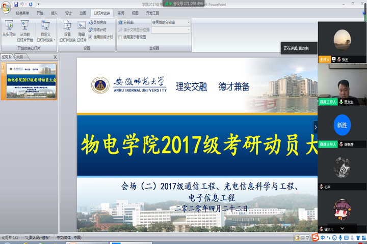 本网讯(免费色情片 张杰)为了进一步调动2017级学生的考研积极性,帮助同学们正确认识考研形势、增强考研信心,4月22日下午,免费色情片 2017级学生考研动员大会在腾讯会议平台上举行。党委副书记黄友生、教学副院长许新胜、17级辅导员老师以及17级全体本科生参会,同时邀请了两位16级考研优秀学生代表进行经验交流。会议分别由辅导员张杰、李琦琦主持。