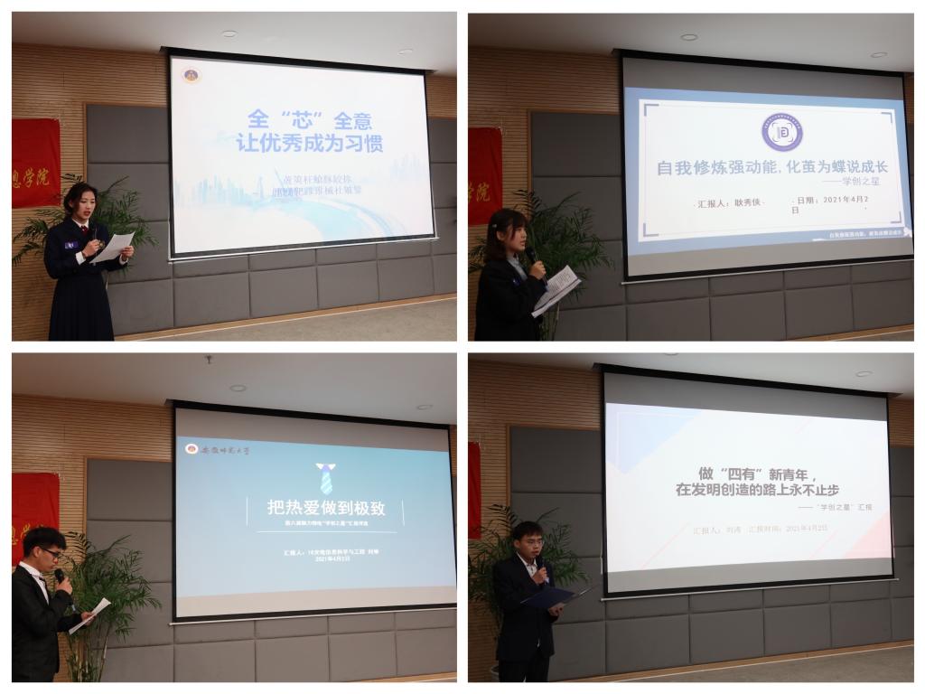 汇报会上,21位青年学子从专业学习、学科竞赛、志愿服务、社会实践等方面分享自身奋斗历程和成长故事。他们中有勤奋学习、勇攀高峰的国奖表率;有矢志“双创”、历练成才的创新达人;有奉献自我、服务社会的公益青年;有品学兼优、拼搏向上的自强之星。他们用朴实感人的语言、丰富多样的素材内容诉说成长路上的亮丽“风景”,以及诸多荣誉背后的汗水与坚持。台下观众深受感染,掌声不断。