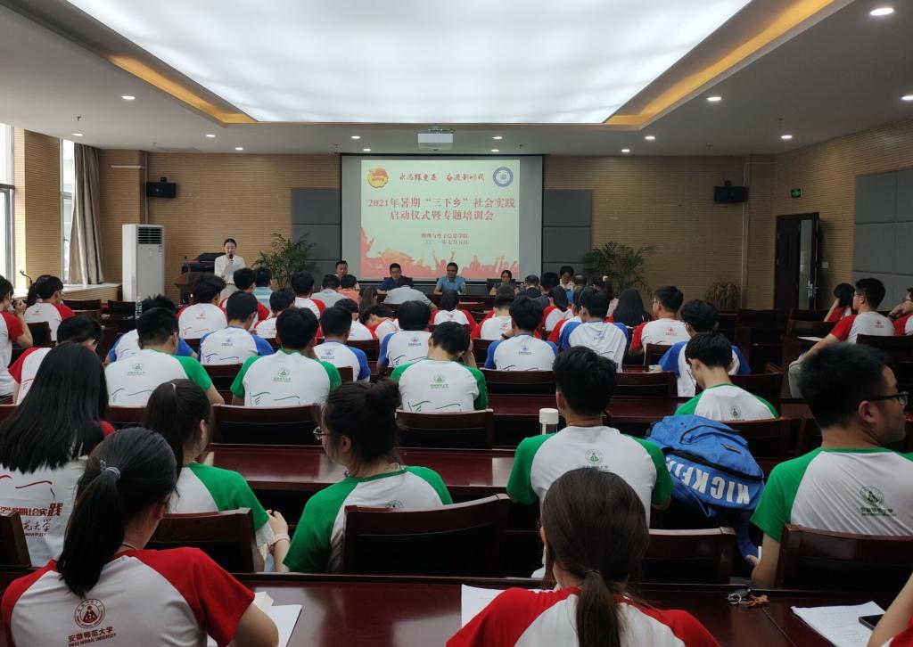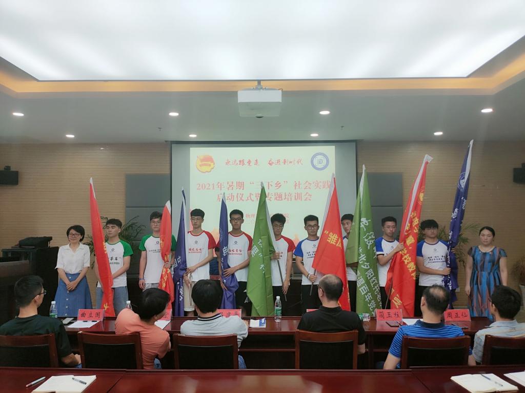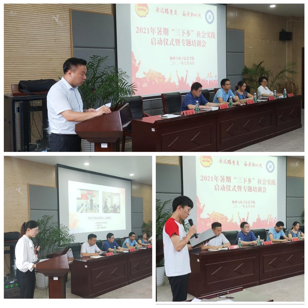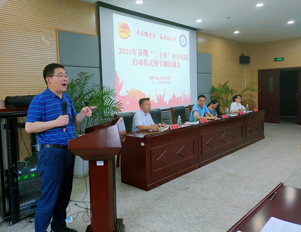 在物理楼304会议室举行2021年暑期“三下乡”社会实践启动仪式暨专题培训会。校团委书记汪凯,社会实践思政指导老师高艳杰,学院院长郑贤锋、院党委副书记黄友生,副院长张爱清,指导教师代表吕建平、冯友宏、曲立国、周正仙、蔺玉柱、甘露,全体专兼职辅导员,社会实践团队代表参加了启动仪式。会议由学院团委书记刘冠琪主持。