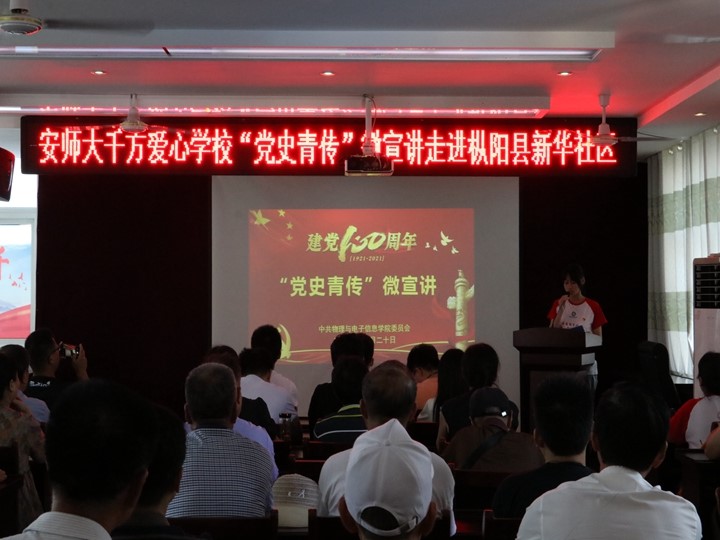 “党史青传”微宣讲走进枞阳县枞阳镇新华社区,2019级物理学(师范)专业学生党员阮楠正进行题为《永不消逝的电波,永不磨灭的精神》的宣讲,这是黎梦茹在暑期的第七次宣讲,此前她已经面向支教所在地的中小学生、其他街道开展了六次。宣讲现场气氛庄重热烈,沉浸式宣讲让观众们多次流下了热泪。
