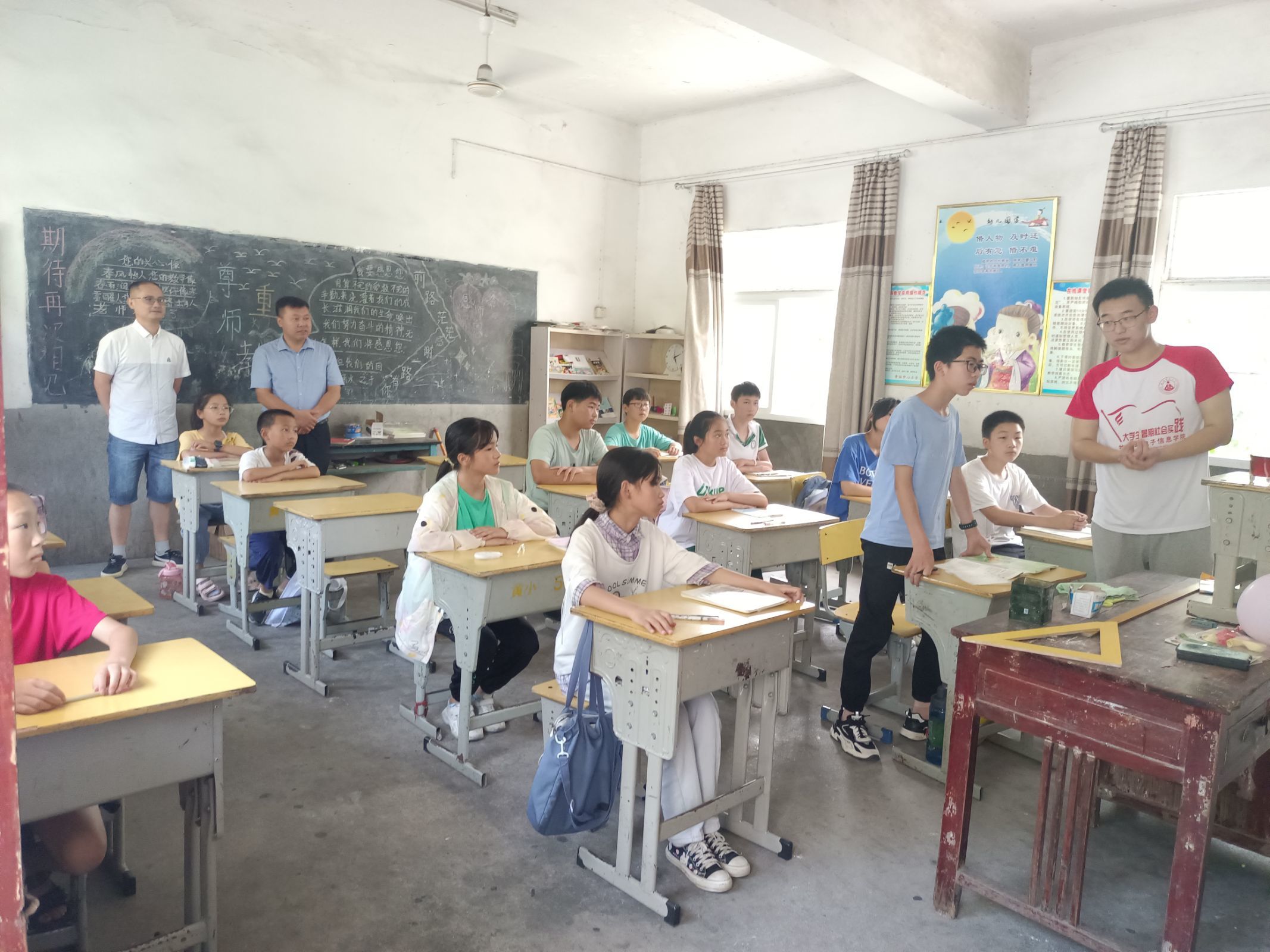 “千方爱心学校”赴潜山市昆仑小学爱心支教团队。黄柏镇镇长聂徐棚、昆仑村村总支书记涂保安、中心校副校长袁绍生、主任汪彭杰陪同慰问。