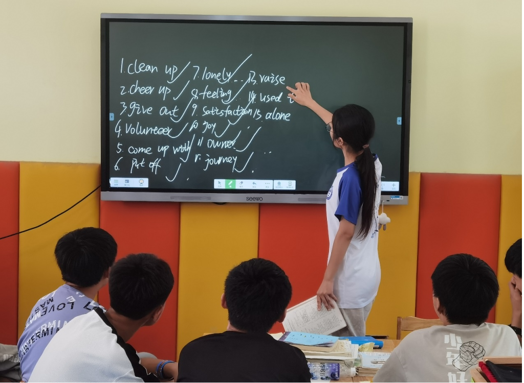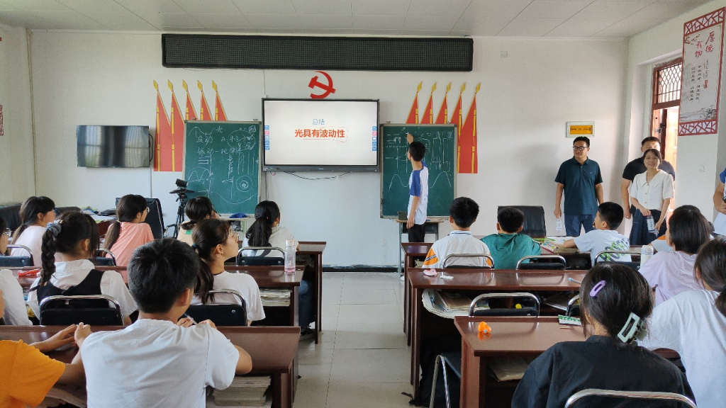 多彩支教课堂,绽放青春色彩。会后,学院领导老师参观了支教课堂。在“金苹果”科普课堂上,队员们通过新奇有趣的实验和清晰细致的讲解,为同学们解开了光的神奇性质——波动的秘密;英语课上,队员们从单词和音标入手,着重向同学们传递学习理念、培养学习习惯、交流学习方法,授人以“渔”。