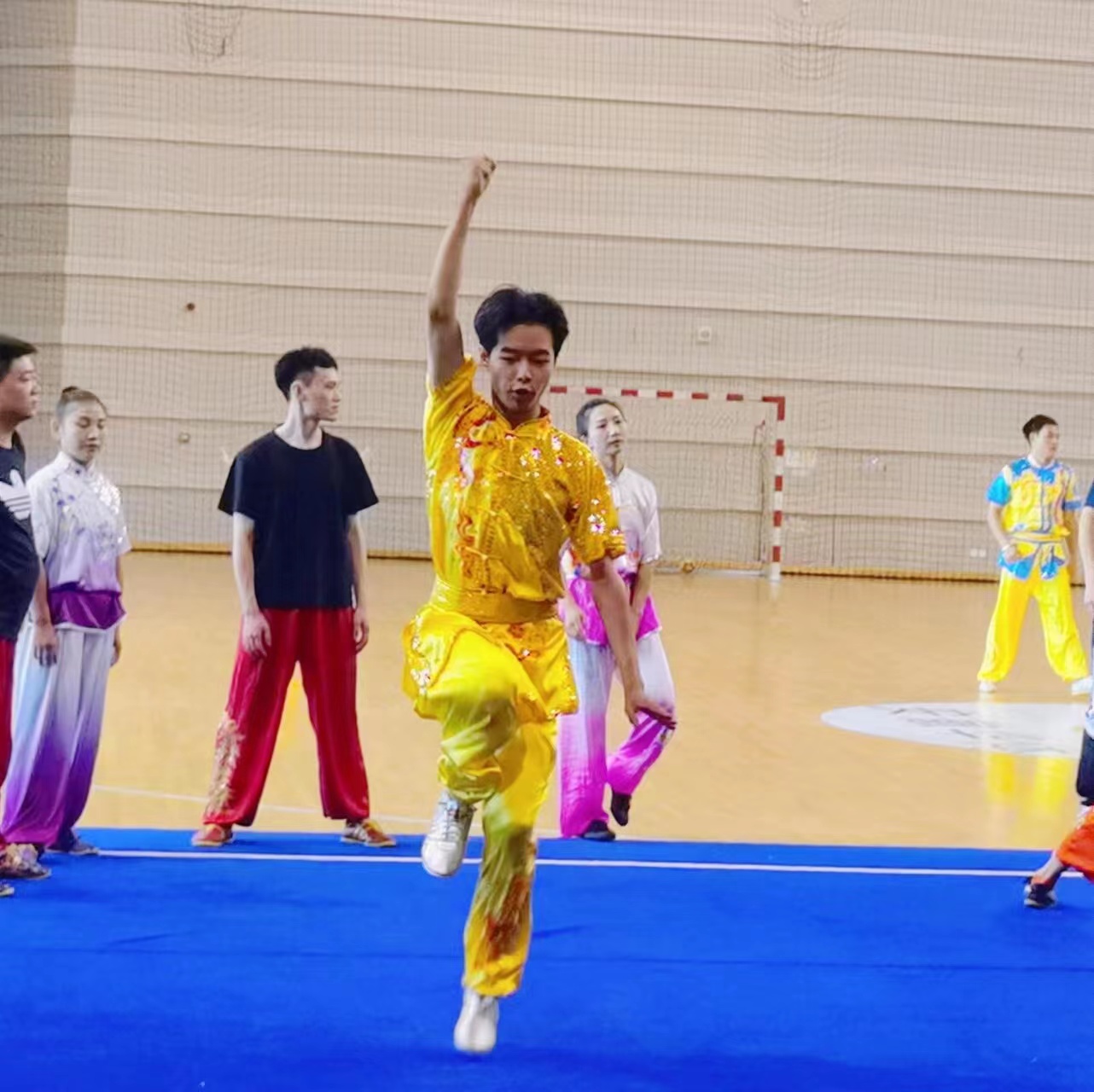 学院老师和同学们第一时间联系戎天琦同学送上了祝贺。去年刚入学,戎天琦就通过选拔加入了校武术队,开启了备战省运会的征程,从未参加过专业比赛的他受到了教练的严格“关照”,晚自习结束、周末放假,别人在休息的时候他却正在训练场上挥洒着汗水,长期与剑、棍打交道使得他的身体也是伤痕累累,十分疲惫。长战线的训练计划、高强度的训练要求,难免会让人产生放弃的念头,“教练总是说,苦不会白吃的,看着手上磨的茧,想想未来站在领奖台上的你,力量总还是能逼一逼的。”戎天琦笑着说道,正是教练一次次的手把手指导,队友们的一句句相互鼓励,相互帮助,才有了今天赛场上的精彩表现。