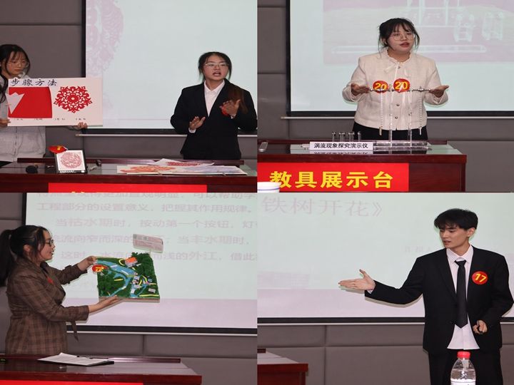 陈健齐团队的光电效应演示仪,巧妙地将测量微观光电子数目转化为测量光电流的强度,利用自制光电效应演示仪带领学生探究光电效应的四个基本规律,用可操作的实验翻开了高中生近代物理中量子理论的篇章;化学与材料科学学院杨妍团队的铁树开花模型,将分子扩散运动这一抽象的概念用充满魔术性和观赏性的现象展示出来,发展学生宏微结合的核心素养;地理与旅游学院陈艺媛团队的月相变化观察模型,模拟了日月地相对关系,以地球观察视角帮助学生直观感受月相变化;生命科学学院郭子晗团队通过立体、直观的DNA二级结构教具帮助学生真实体会三种常见DNA二级结构:A-DNA、B-DNA、Z-DNA之间的区别,真切地认识到DNA的二级结构基础;美术学院王甜甜团队展示制作不同颜色、造型、材质和装饰的精美灯饰,让学生直观的探究学习灯饰的造型、装饰手法和影响灯光的因素;教育科学学院卫茹萍团队以超轻黏土为主要材料,由底板和可拆卸部件组成教具,以立体形态展现民族分布情况让学生更加直观地感受我国各民族的区域分布特点以及民族服饰特色。参赛的作品多种多样,各团队结合PPT详细讲解了教具的制作过程,并通过现场演示直观地展示了教具的教学用途,赢得了在场老师和同学们的阵阵喝彩。