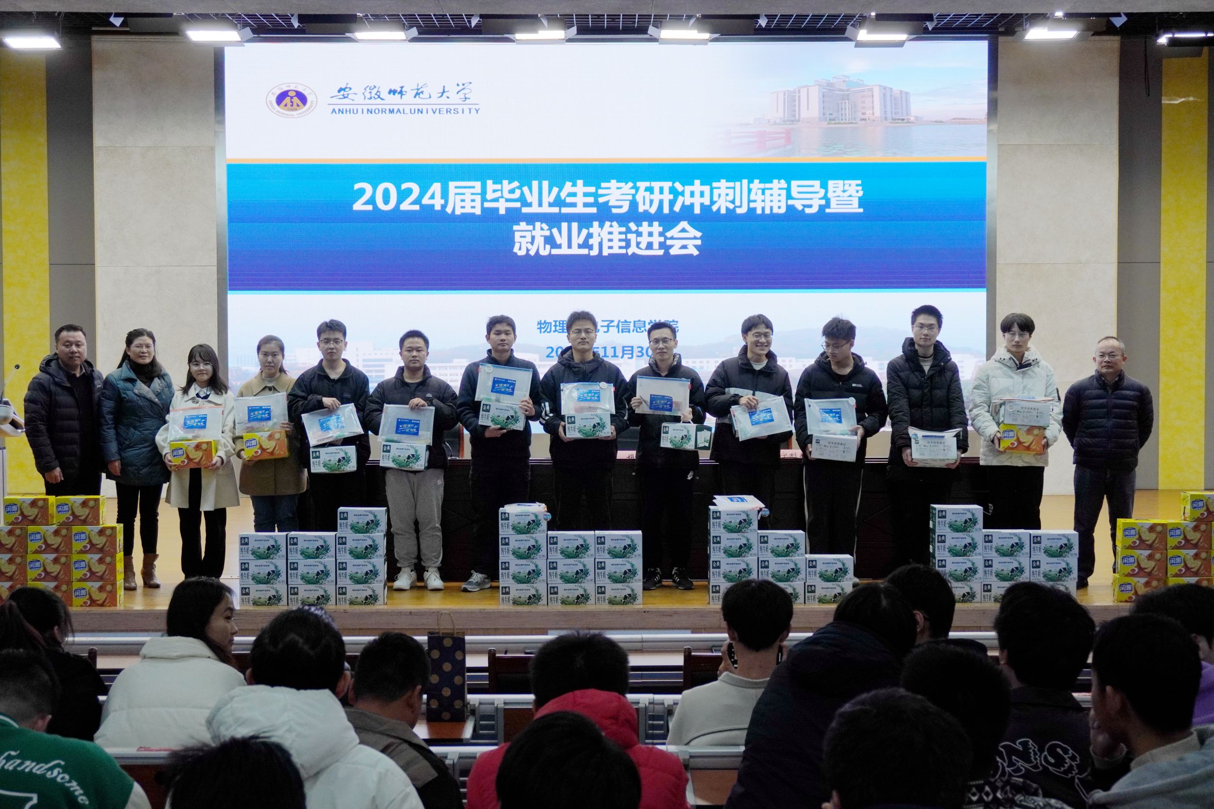 会上,黄友生逐项布置了2024届毕业生考研、就业、参军入伍、安全和反电诈等工作。他以“三种机遇”“两种关系”“一个底线”展开,希望同学们要抓住就业的机遇期,积极主动应聘;抓住考研的机遇期,不要半途而废和逃避式倒退;抓住征兵入伍的机遇期,积极参军入伍;要统筹好考研和就业的关系,不要顾此失彼;要坚守好安全底线,注重人身安全、财产安全、信息安全,树牢反电诈意识。宁利新作考研冲刺辅导。他结合考研实际案例出发,要求同学们思想上要高度重视,克服困难,合理规划,坚持到底。他还结合自身体会和近年来学院考研情况,为考研学生提出了具体建议。李娟作总结讲话。她强调在就业的黄金期和考研的关键期,希望全体同学要做到有信心、有恒心、有平常心、更要齐心,积极主动地做好求职和考研工作,预祝2024届毕业班全体学生能够所向披靡,金榜题名。随后,全体领导老师为学生代表颁发考研慰问品并合影留念。