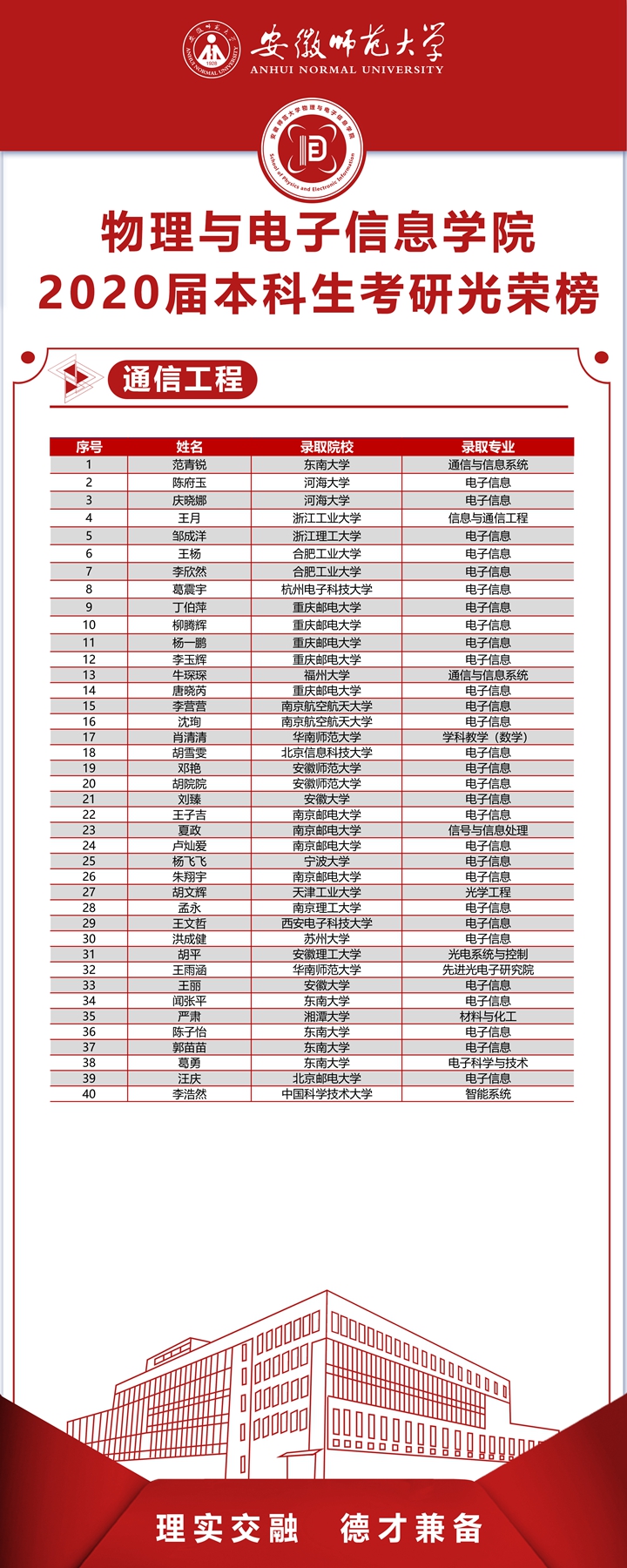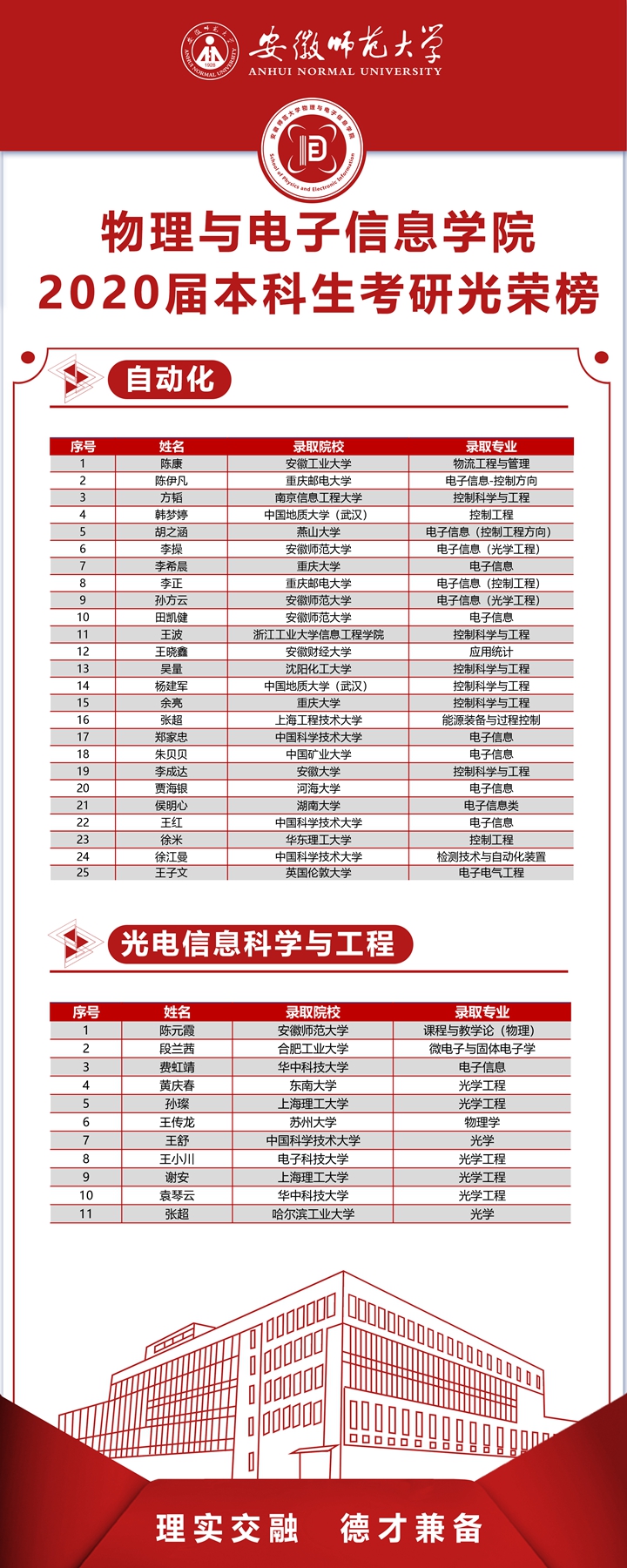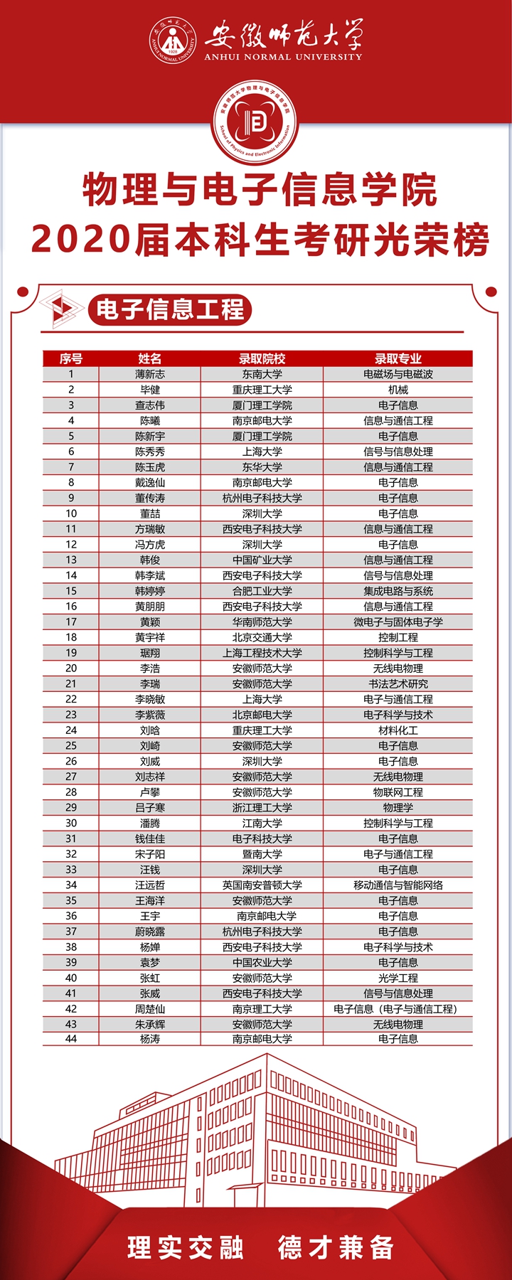本网讯(免费色情片 宋凤楼)披星戴月研考路,奋力拼搏谱华章。2020年全国硕士研究生招生录取工作行将结束,免费色情片 2020届本科毕业生升研率创历届新高。学院2020届本科毕业生共421人,成功考取研究生166人(含出国留学2人),研究生录取率39.43%,较以往提高近6个百分点。其中,物理学专业54.12%,电子信息工程专业35.48%,通信工程专业42.11%,光电信息科学与工程专业23.91%,自动化专业35.21%;进入“双一流”高校、科研院所人数占录取总数60%,含浙江大学、南京大学、中国科技大学、武汉大学、北京师范大学、厦门大学、英国伦敦大学等。