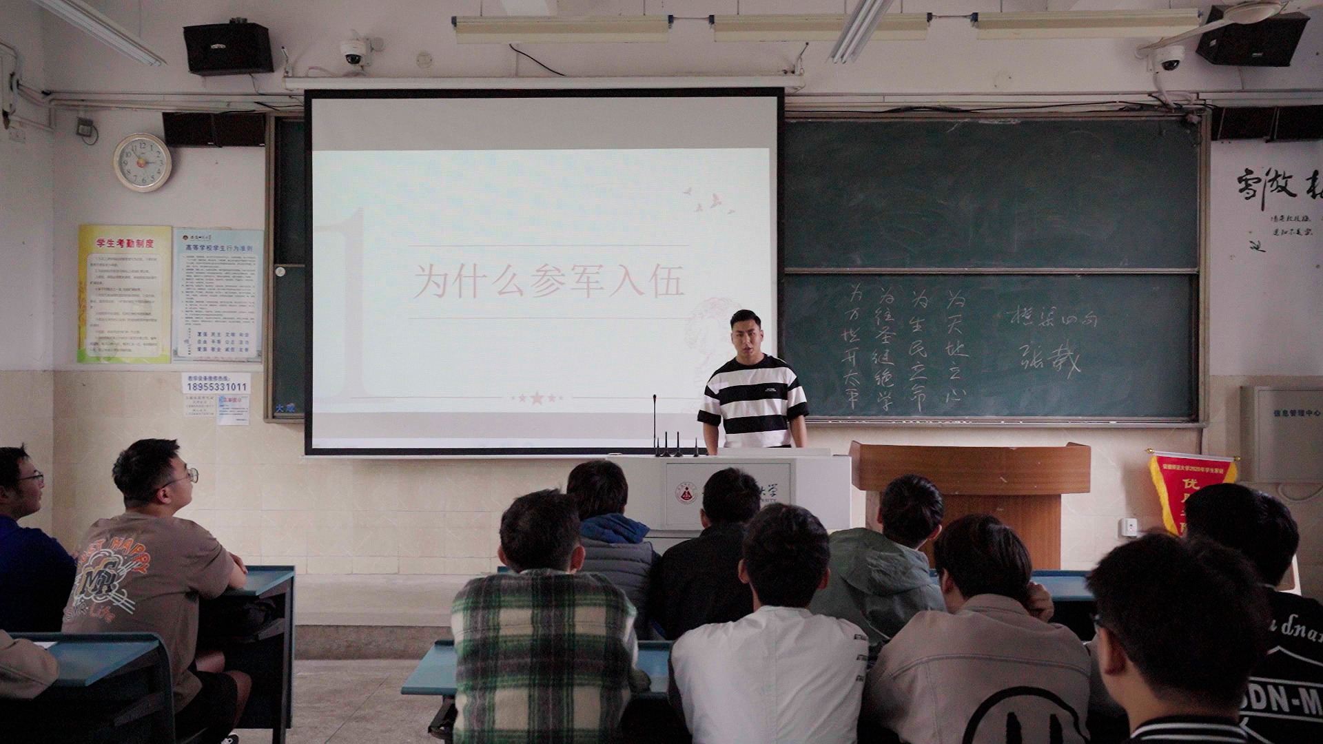 会上,“校十佳大学生”、地理与旅游学院2020级本科生阿卜来提·阿卜力克木向全体同学介绍了国家对毕业生参军入伍提供的相关政策,2019级电子信息工程专业退伍学生王旭与大家分享了参军对本人的深刻影响和自己的深刻感触,鼓励同学们积极响应国家号召,立志献身国防事业,为国防建设奉献青春力量。随后辅导员详细介绍高校大学毕业生应征入伍可享有的考学考公、学费和助学贷款代偿以及退役后享受就学就业优惠等优抚政策。