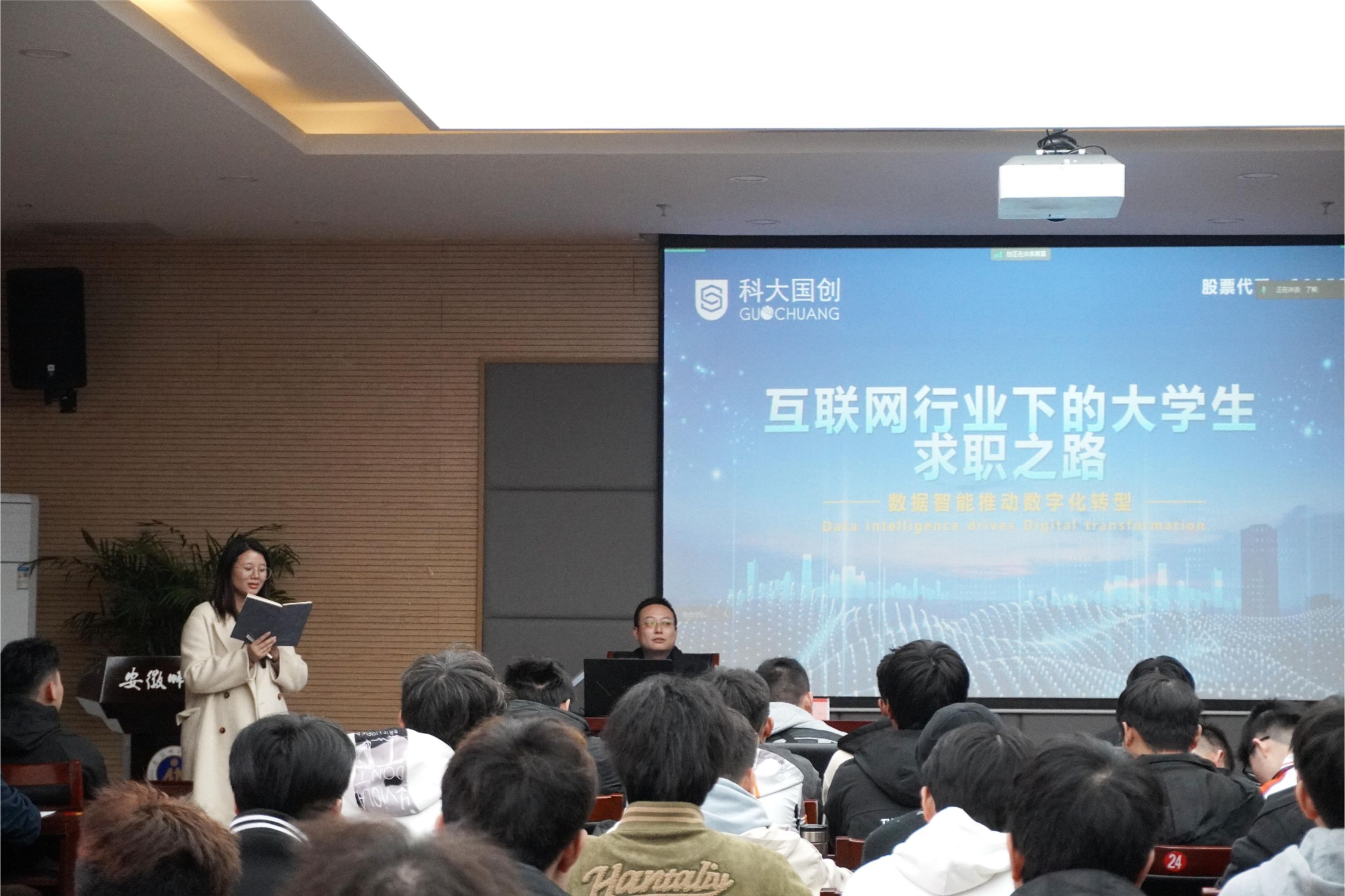 邀请科大国创云网科技有限公司招聘负责人汪贤峰,以线上线下同步进行的方式开展《互联网行业下的大学生求职之路》就业指导专题讲座。讲座由院2021级专职辅导员李慧芳主持。
