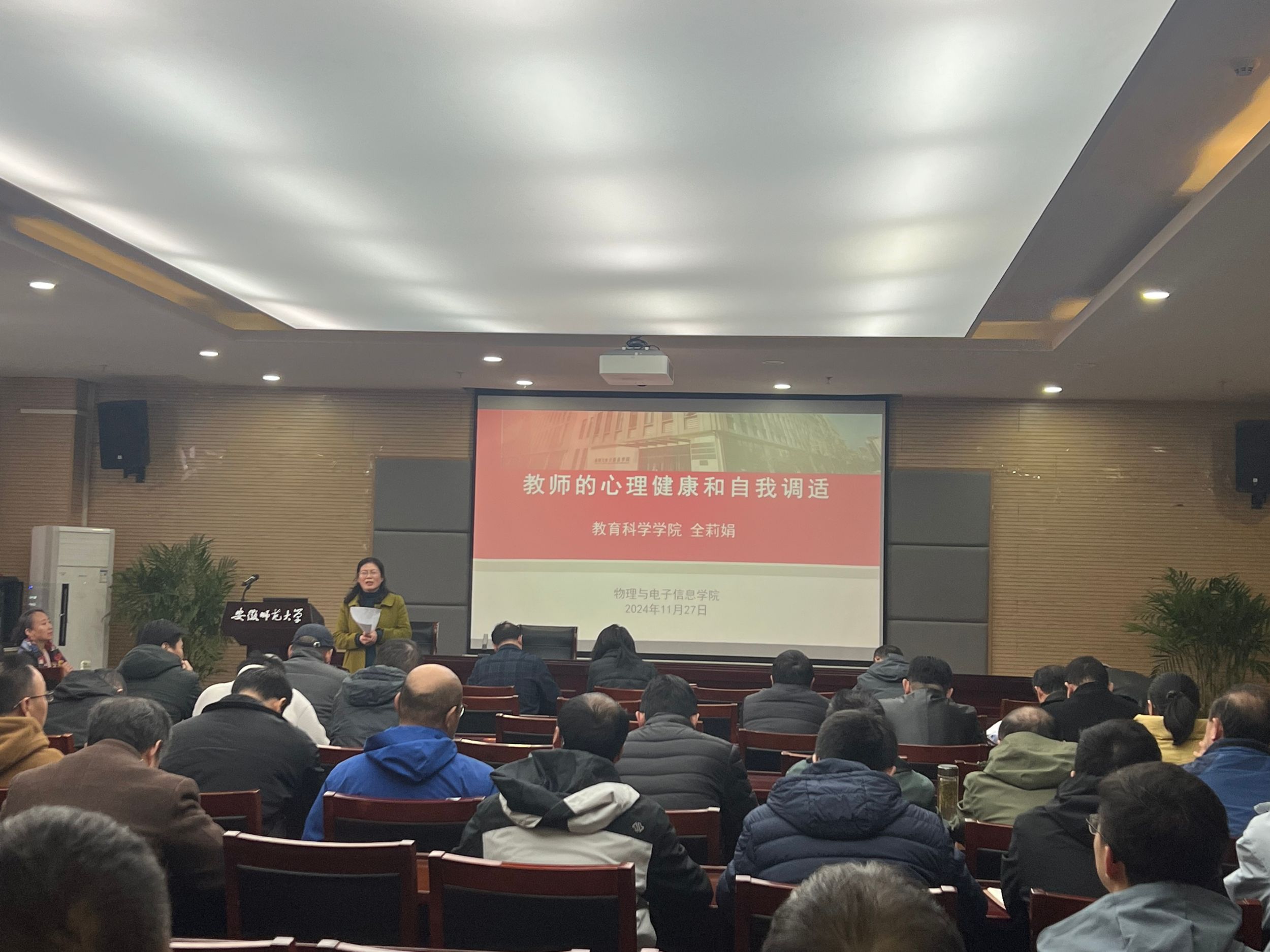 会上,省心理学会副秘书长、教育科学学院心理学副教授、硕士生导师全莉娟受邀为全体教职工作题为《教师的心理健康和自我调适》专题辅导报告。全老师的讲座非常精彩,深情并茂,通俗易懂,详细分析了压力来源,全面介绍了自我调适的科学方法,全院教职工深受启发,获益匪浅。李娟领学了习近平总书记给中国海洋大学全体师生的重要回信、致中山大学建校100周年的重要贺信精神和对广东珠海市驾车冲撞行人案件作出的重要指示精神,与会人员集中学习了《工业和信息化部 教育部 科技部关于向“时代楷模”杨士莪同志学习的决定》文件精神。