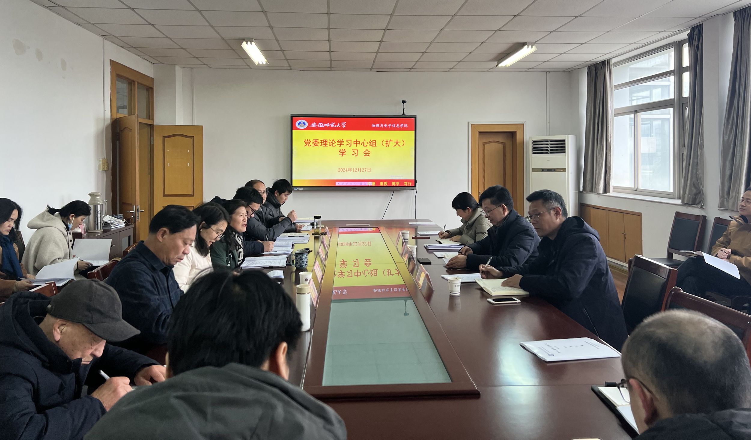 12月27日下午,物理与电子信息学院召开党委理论学习中心组(扩大)学习会,学校党委理论学习中心组列席旁听工作组第7组成员王峰、顾凌、胡婷列席旁听指导。院党委书记李娟主持会议并讲话。院领导班子成员、党委委员、党支部书记参加会议。