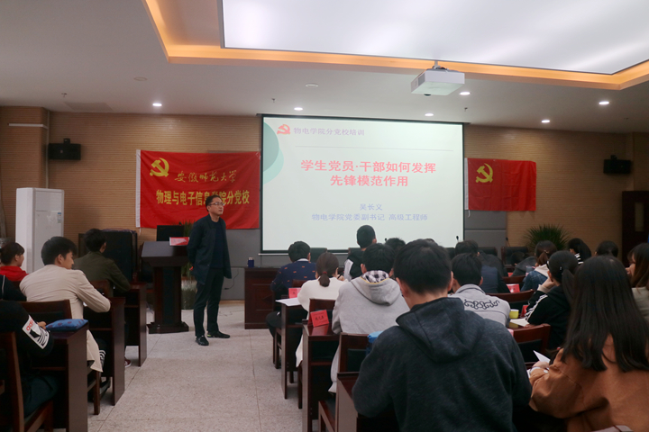 党委副书记吴长义,他所讲授的内容是党员和学生干部如何发挥模范带头作用。第五期党员培训班的同学,学生会干部以及本科生、研究生学生干部等聆听报告。