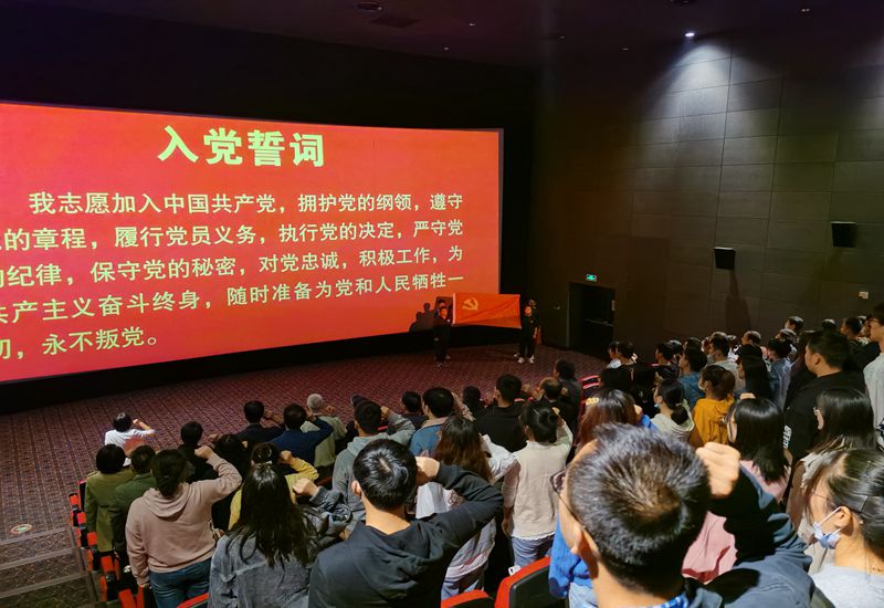 影片开始前,学院党委书记李娟带领全体党员面向党旗重温入党誓词。之后,她指出,为深入学习贯彻习近平总书记“七一”重要讲话精神,推动党史学习教育扎实开展,学院党委通过发挥电影这一可视化教材的独特作用,教育引导广大党员做到学党史、悟思想、办实事、开新局。