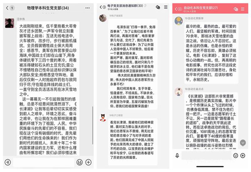 观影结束后,各支部围绕电影内容,结合习近平总书记“七一”重要讲话精神,运用线上线下相结合的方式展开研讨。教师党员在研讨中一致认为,三个小时的观影过程,不仅是一场视觉盛宴,更是一场爱国主义教育,作为教育者,我们要用党在百年奋斗中形成的伟大精神滋养自己、激励自己,以昂扬的精神状态做好教书育人工作,做到为党育人、为国育才。学生党员表示革命先烈们永不放弃、吃苦耐劳和艰苦奋斗的精神将砥砺自己更加坚定目标、脚踏实地、刻苦钻研、努力拼搏,不断增强学识才干,力争能成为堪当民族复兴大任的时代新人。