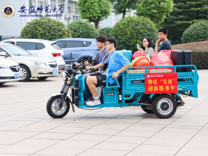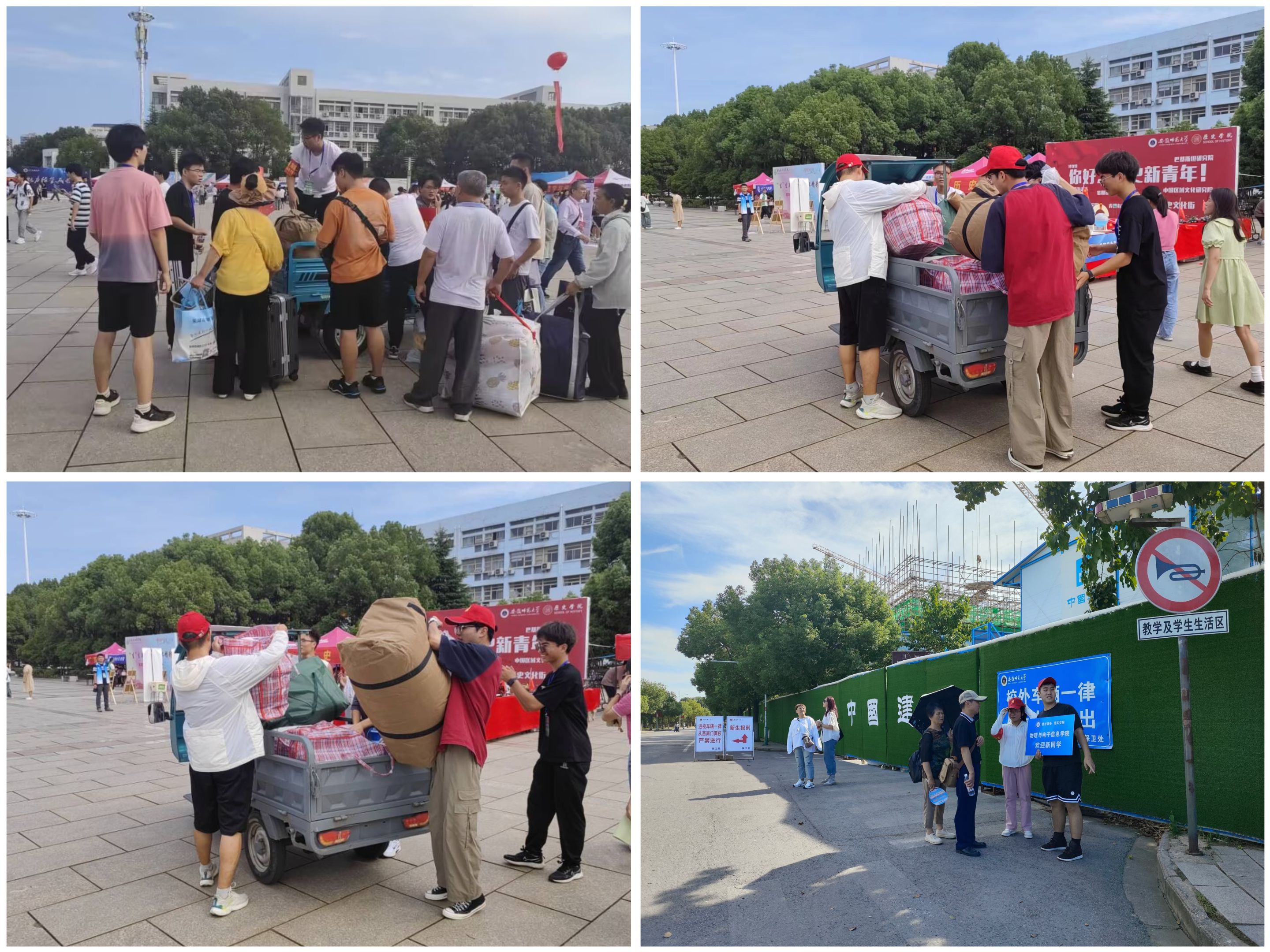 先锋车上满载新生的行李和大汗淋漓的学生党员。他们配合默契、安排有序地将行李送至相应宿舍并搬运上楼。在路上,他们热心地向学弟学妹们介绍学校布局和生活中的注意事项,帮助新生尽快熟悉校园生活。