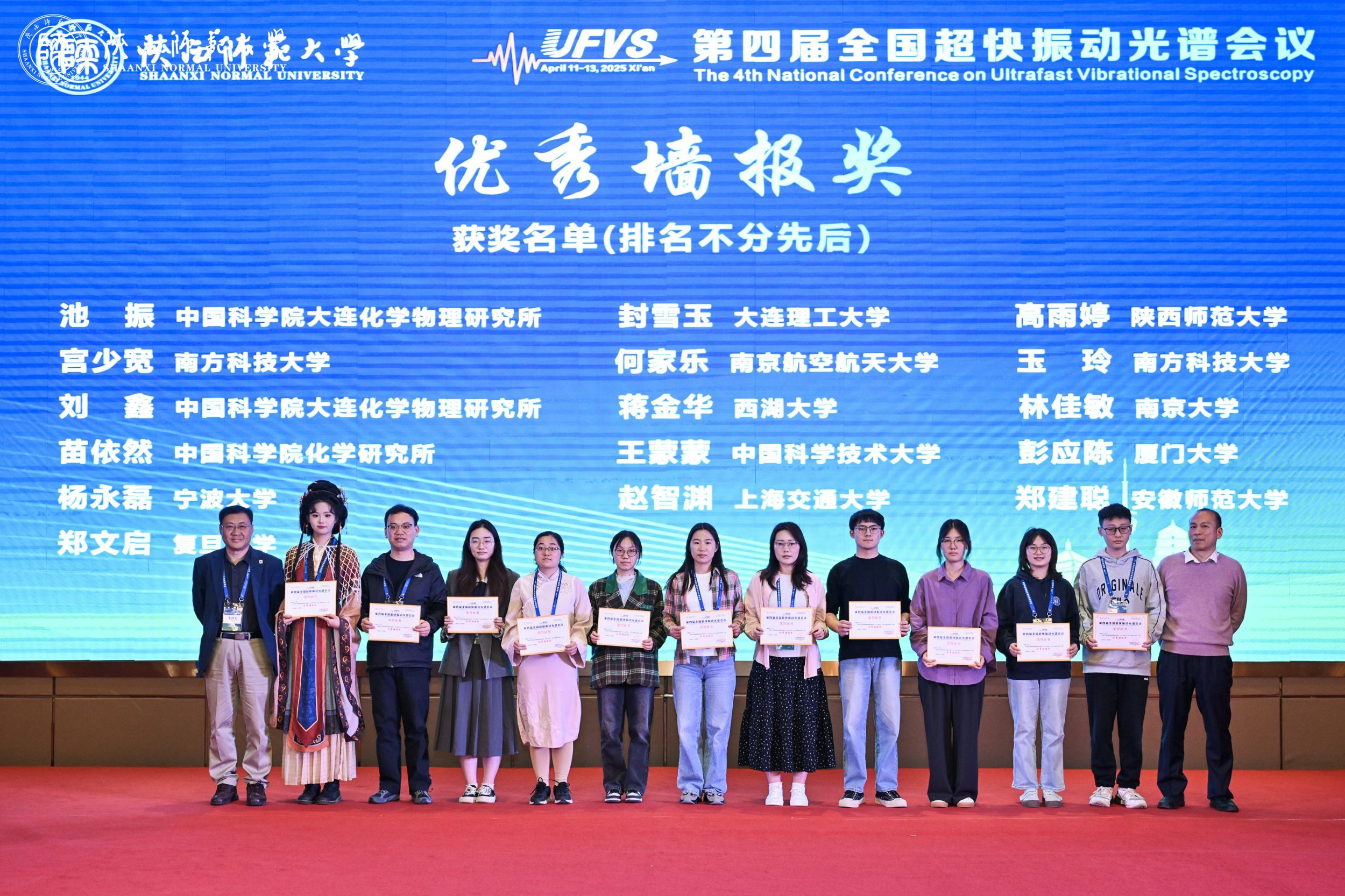 2025年4月11日至13日,由陕西师范大学化学化工学院和应用表面与胶体化学教育部重点实验室主办的第四届全国超快振动光谱会议在西安斯瑞特酒店成功召开。全国40余家单位的200多名代表出席会议。到会专家围绕“时间分辨红外光谱与飞秒多维振动光谱”、“和频振动光谱”、“稳态及时间分辨拉曼光谱”、“时间分辨太赫兹光谱”、“红外与太赫兹光源”、“超快振动光谱理论”、“超快电子光谱中的电子-振动耦合与电子-声子散射现象”等七个主题,充分探讨和交流了超快振动光谱领域最新研究进展以及相关理论计算和实验技术的发展。课题组陆洲教授应邀在会议上作了题为《低维碘化铅钙钛矿和频振动光谱及电声耦合研究》的学术报告。课题组郑建聪、梁超龙和吴章友三位同学参加了会议并以墙报形式分别汇报了《高度畸变手性二维铅基钙钛矿和频振动光谱及载流子超快动力学研究》、《碳酸酯类电解液溶剂界面和频振动光谱研究》和《锂离子电池硅电极/电解液界面分子结构的和频光谱研究》等方面的研究进展,充分展示了安徽师范大学非线性光谱与超快动力学研究组青年学子的风采。经专家评选,郑建聪同学荣获优秀墙报奖。